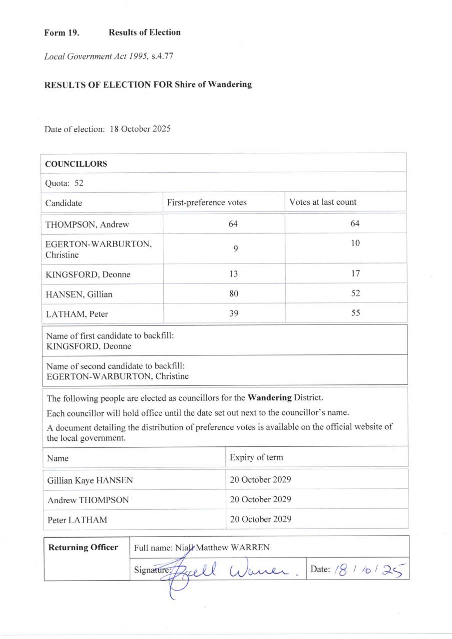 The Shire of Wandering is pleased to announce the results of the Local Government elections held on Saturday. We extend our sincere gratitude to all members of the community who participated—whether by nominating or voting. Your involvement played a vital role in shaping the future of our Shire.